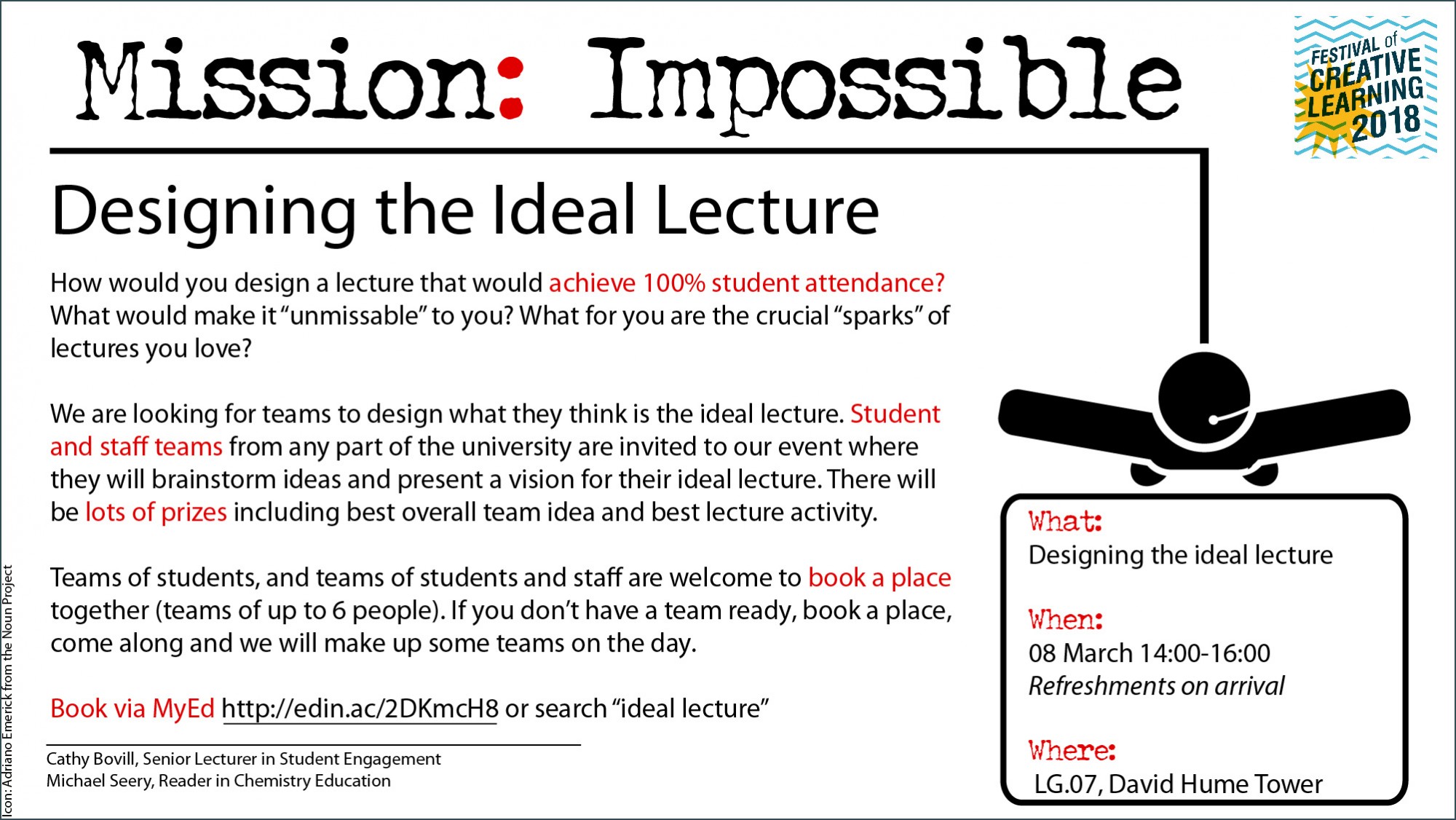 We are looking for teams to design what they think is the ideal lecture. Student and staff teams from any part of the university are invited to our event where they will brainstorm ideas and present a vision for their ideal lecture. There will be lots of prizes including best overall team idea and best lecture activity.